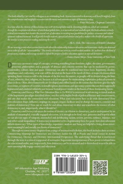 A volume in Critical Constructions: Studies on Education and Society Series Editors: Curry Stephenson Malott, West Chester University of Pennsylvania; Brad J. Porfilio, California State University, East Bay; Marc Pruyn, Monash University; and Derek R. Ford, Syracuse University Democracy can mean a range of concepts, covering everything from freedoms, rights, elections, governments, processes, philosophies and a panoply of abstract and concrete notions that can be mediated by power, positionality, culture, time and space. Democracy can also be translated into brute force, hegemony, docility, compliance and conformity, as in wars will be decided on the basis of the needs of elites, or major decisions about spending finite resources will be the domain of the few over the masses, or people will be divided along the lines of race, ethnicity, class, religion, etc. because it is advantageous for maintaining exploitative political systems in place to do so. Often, these frameworks are developed and reified based on the notion that elections give the right to societies, or segments of societies, to install regimes, institutions and operating systems that are then supposedly legitimated and rendered infinitely just because formal power resides in the hands of those dominating forces. This book is interested in advancing a critical analysis of the hegemonic paradigm described above, one that seeks higher levels of political literacy and consciousness, and one that makes the connection with education. What does education have to do with democracy? How does education shape, influence, impinge on, impact, negate, facilitate and/or change the context, contours and realities of democracy? How can we teach for and about democracy to alter and transform the essence of what democracy is, and, importantly, what it should be? This book advances the notion of decency in relation to democracy, and is underpinned by an analysis of meaningful, critically-engaged education. Is it enough to be kind, nice, generous and hopeful when we can also see signs of rampant, entrenched and debilitating racism, sexism, poverty, violence, injustice, war and other social inequalities? If democracy is intended to be a legitimating force for good, how does education inform democracy? What types of knowledge, experience, analysis and being are helpful to bring about newer, more meaningful and socially just forms of democracy? Throughout some twenty chapters from a range of international scholars, this book includes three sections: Constructing Meanings for Democracy and Decency; Justice for All as Praxis; and Social Justice in Action for Democracy, Decency, and Diversity: International Perspectives. The underlying thread that is interwoven through the texts is a critical reappraisal of normative, hegemonic interpretations of how power is infused into the educational realm, and, importantly, how democracy can be re-situated and re-formulated so as to more meaningfully engage society and education.