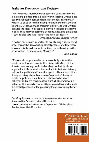 Do voters in large scale democracies reliably vote for the electoral outcomes most in their interest? Much of the literature on voting predicts that they do, but this book argues that fully rational voters will not, in fact, consistently vote for the political outcomes they prefer. The authors offer a theory of voting which they term an 'expressive' theory of electoral politics. This theory is shown to be more coherent and more consistent with actual observed voting behaviour. This important book offers a compelling challenge to the central premises of the prevailing theories of voting behaviour.