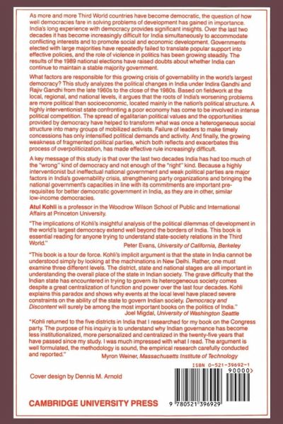 Long considered one of the great successes of the developing world, India has in recent years experienced growing challenges to political order and stability. Dominant social groups face growing demands of newly organized social groups, often leading to intense violence, and the once hegemonic Congress party has forfeited its commanding role, culminating in the defeat of Rajiv Gandhi in the recent national elections. Institutional mechanisms for the resolution of conflict have broken down, the civil and police services have become highly politicized, and the state bureaucracy appears incapable of implementing an effective plan for economic development. In this book, Atul Kohli analyzes political change in India from the late 1960s to the late 1980s. Based on research conducted at the local, state and national level, the author analyzes the changing patterns of authority in and between the center and periphery. He combines rich empirical investigation, extensive interviews and theoretical perspectives in developing a detailed explanation of the growing crisis of governance his research reveals. The book will be of interest to both specialists in Indian politics and to students of comparative politics more generally as an analysis of political patterns that evolve in democratic governments in developing countries. Atul Kohli is an Associate Professor at the Woodrow Wilson School of International Affairs, Princeton University. He is the author of The State and Poverty in India: The Politics of Reform (CUP, 1987).