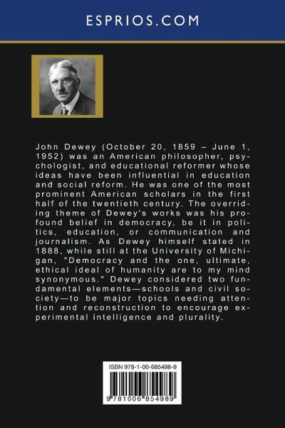 John Dewey (October 20, 1859 - June 1, 1952) was an American philosopher, psychologist, and educational reformer whose ideas have been influential in education and social reform. He was one of the most prominent American scholars in the first half of the twentieth century. The overriding theme of Dewey's works was his profound belief in democracy, be it in politics, education, or communication and journalism. As Dewey himself stated in 1888, while still at the University of Michigan, "Democracy and the one, ultimate, ethical ideal of humanity are to my mind synonymous." Dewey considered two fundamental elements-schools and civil society-to be major topics needing attention and reconstruction to encourage experimental intelligence and plurality.