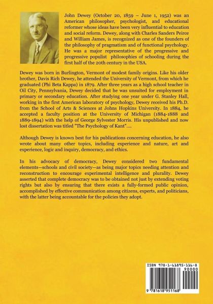 John Dewey (October 20, 1859 - June 1, 1952) was an American philosopher, psychologist, and educational reformer whose ideas have been very influential to education and social reform. Dewey, along with Charles Sanders Peirce and William James, is recognized as one of the founders of the philosophy of pragmatism and of functional psychology. He was a major representative of the progressive and progressive populist philosophies of schooling during the first half of the 20th century in the USA. In his advocacy of democracy, Dewey considered two fundamental elements-schools and civil society-as being major topics needing attention and reconstruction to encourage experimental intelligence and plurality. Dewey asserted that complete democracy was to be obtained not just by extending voting rights but also by ensuring that there exists a fully-formed public opinion, accomplished by effective communication among citizens, experts, and politicians, with the latter being accountable for the policies they adopt.