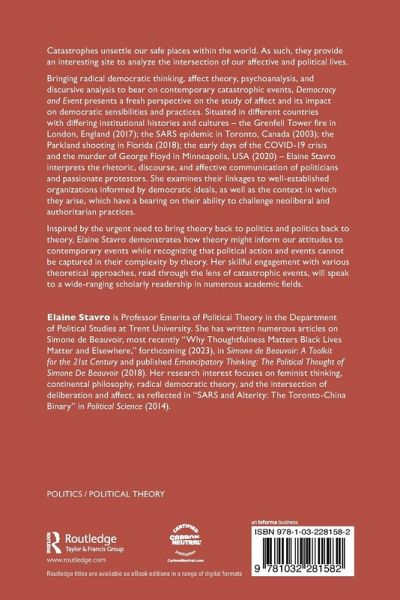Bringing radical democratic thinking, affect theory, psychoanalysis, and discursive analysis to bear on contemporary catastrophic events, Democracy and Event presents a fresh perspective on the study of affect and its impact on democratic sensibilities and practices. Situated in different countries with differing institutional histories and cultures - the Grenfell Tower fire in London, England (2017); the SARS epidemic in Toronto, Canada (2003); the Parkland shooting in Florida (2018); the early days of the COVID-19 crisis and the murder of George Floyd in Minneapolis, USA (2020) - Elaine Stavro interprets the rhetoric, discourse, and affective communication of politicians and passionate protestors. She examines their linkages to well-established organizations informed by democratic ideals, as well as the context in which they arise, which have a bearing on their ability to challenge neoliberal and authoritarian practices.