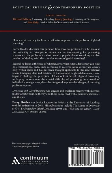 How can democracy facilitate an effective response to the problem of global warming? Barry Holden discusses this question from two perspectives. First he looks at the suitability in principle of democratic decision-making for generating responses to the problem: to what extent is popular decision making a viable method of dealing with the complex matter of global warming? Second, he looks at the issue of whether, or to what extent, democracy can exist on a supranational scale, since according to received ideas, democracy occurs only within states and has not been thought applicable to the international realm. Emerging ideas and practices of transnational or global democracy have begun to challenge this perception. Holden looks at the role of global democracy in helping to overcome the crucial difficulty of generating, in a world of individual sovereign states, the collective global response that the global warming problem requires.Democracy and Global Warming will engage and challenge readers with interests in democratic political theory and those concerned with environmental issues and threats.