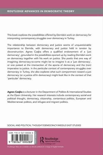 This book explores the possibilities offered by Derrida's work on democracy for interpreting contemporary struggles over democracy in Turkey. The relationship between democracy and justice seems of unquestionable importance to Derrida, with democracy and justice held in tension by deconstruction. Agnes Czajka offers a qualified endorsement of a 'just democracy', grounded in the possibilities opened up by reading Derrida's work on democracy together with his work on justice. She posits that one way of imagining democracy-to-come might be to imagine it as a 'just democracy', or one poised at the intersection of the aporia of democracy and the (non)imperative to justice. In the particular context of contemporary struggles over democracy in Turkey, she also explores what such comportment toward a just democracy (or a justice of/in democracy) might look like in the context of that 'particular' democracy.