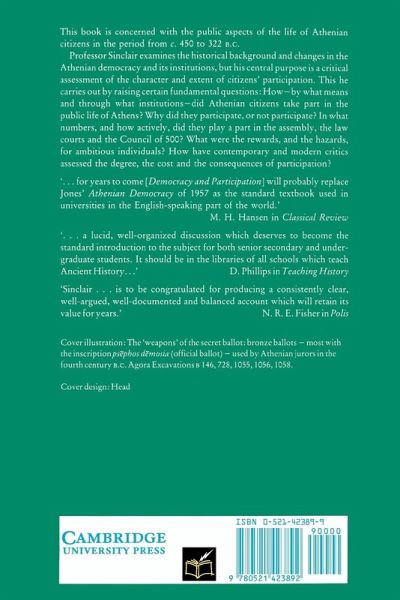 This book is concerned with the public aspects of the life of Athenian citizens in the period from c.450 to 322 BC. Its central purpose is a critical assessment of the character and extent of citizens' participation in the running of the democracy, by raising certain fundamental questions. By what means and through which institutions did Athenian citizens participate in the public life of Athens Professor Sinclair's analysis is made from the point of view of the individual citizen - his privileges and opportunities, his responsibilities, the rewards and the dangers of exploiting the opportunities available to him.