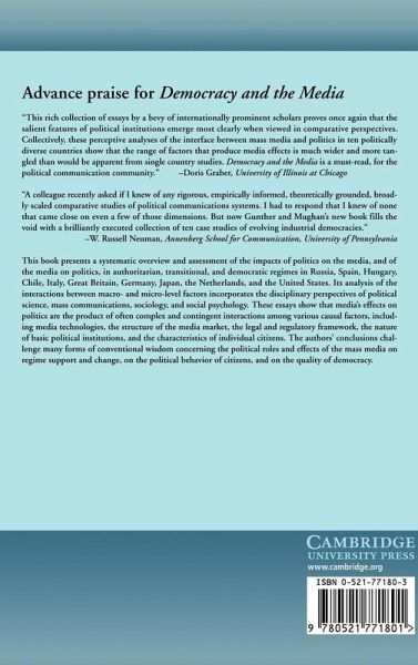 1. The media in democratic and non-democratic regimes: a multilevel perspective Anthony Mughan and Richard Gunther; 2. Politics and the media in Spain: from dictatorship to democracy Richard Gunther, José Ramón Montero and José Ignacio Wert; 3. Institutional incapacity, the attentive public and media pluralism in Russia Ellen Mickiewicz; 4. Democratic transformation and the mass media in Hungary: from Stalinism to democratic consolidation Miklos Sükösd; 5. The modernization of communications: the media in the transition to democracy in Chile Eugenio Tironi and Guillermo Sunkel; 6. Media influence in the Italian transition from a consensual to a majoritarian democracy Carlo Marletti and Franca Roncarolo; 7. The United States: news in a free-market society Thomas Patterson; 8. Japan: news and politics in a media-saturated democracy Ellis S. Krauss; 9. The Netherlands: the media in a depillarized society Cees van der Eijk; 10. Great Britain: the end of the 'News at Ten' and the changing news environment Holli S. Semetko; 11. The media and politics in the New Germany Max Kaase; 12. The political impact of the mass media: a reassessment Richard Gunther and Anthony Mughan.