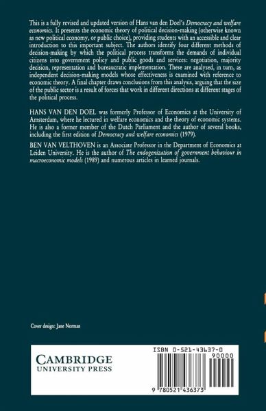This is a fully revised and updated version of Hans van den Doel's Democracy and welfare economics. It presents the economic theory of political decision-making (otherwise know as new political economy, or public choice), providing students with an accessible and clear introduction to this important subjects.