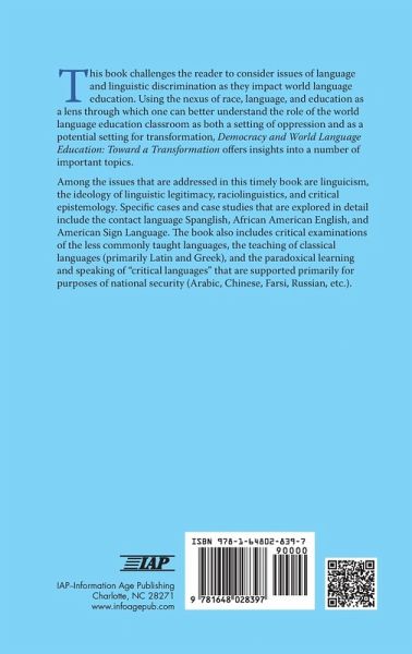 This book challenges the reader to consider issues of language and linguistic discrimination as they impact world language education. Using the nexus of race, language, and education as a lens through which one can better understand the role of the world language education classroom as both a setting of oppression and as a potential setting for transformation, Democracy and World Language Education: Toward a Transformation offers insights into a number of important topics. Among the issues that are addressed in this timely book are linguicism, the ideology of linguistic legitimacy, raciolinguistics, and critical epistemology. Specific cases and case studies that are explored in detail include the contact language Spanglish, African American English, and American Sign Language. The book also includes critical examinations of the less commonly taught languages, the teaching of classical languages (primarily Latin and Greek), and the paradoxical learning and speaking of "critical languages" that are supported primarily for purposes of national security (Arabic, Chinese, Farsi, Russian, etc.).
