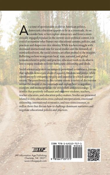 At a time of questionable civility in American politics, democratic education appears to be at a crossroads. As we consider how to best explore democracy and foster a more civically-engaged populace in the current socio-political context, it is critical to examine what frames our educational systems, policies, and practices and shapes our civic identity. While teachers struggle with decreased instructional time for social studies and the demands of standardized tests, the social sciences are often pushed to the margins. Reflecting on how to negotiate local, state, national, and global tensions related to policy and practice, educators work to do what is best to equip students to foster democratic citizenship and ideals. Social sciences educators are uniquely positioned to embrace a journey that upholds democratic ideals of equality, freedom, and justice, while simultaneously critiquing inequity and injustice in schools and our society. The contributors to this volume situate a variety of discussions within the context of the crossroads and explore how to negotiate, translate, and reconceptualize our own beliefs and positionings in ways that positively influence and empower students, teachers, teacher educators, and education policy makers. Studies are presented related to civic education, cross-cultural interpretations, emotional citizenship, international economics, and race-consciousness, as well as those that discuss how to challenge dominant narratives and negotiate educational policies and practices.