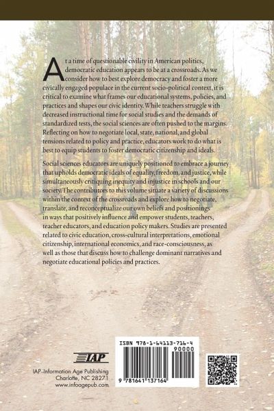 At a time of questionable civility in American politics, democratic education appears to be at a crossroads. As we consider how to best explore democracy and foster a more civically-engaged populace in the current socio-political context, it is critical to examine what frames our educational systems, policies, and practices and shapes our civic identity. While teachers struggle with decreased instructional time for social studies and the demands of standardized tests, the social sciences are often pushed to the margins. Reflecting on how to negotiate local, state, national, and global tensions related to policy and practice, educators work to do what is best to equip students to foster democratic citizenship and ideals. Social sciences educators are uniquely positioned to embrace a journey that upholds democratic ideals of equality, freedom, and justice, while simultaneously critiquing inequity and injustice in schools and our society. The contributors to this volume situate a variety of discussions within the context of the crossroads and explore how to negotiate, translate, and reconceptualize our own beliefs and positionings in ways that positively influence and empower students, teachers, teacher educators, and education policy makers. Studies are presented related to civic education, cross-cultural interpretations, emotional citizenship, international economics, and race-consciousness, as well as those that discuss how to challenge dominant narratives and negotiate educational policies and practices.