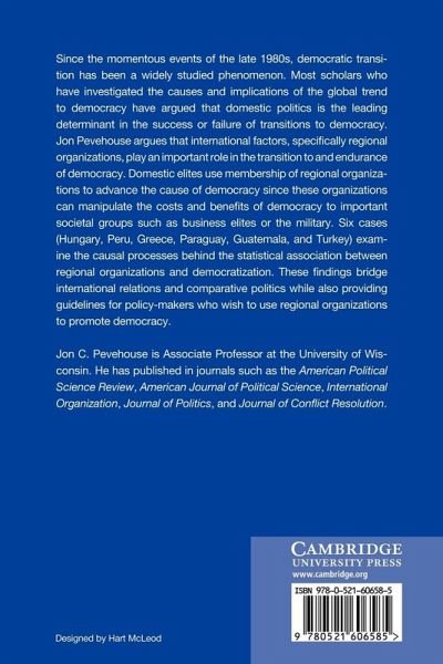 Since the momentous events of the late 1980s, democratic transition has been a widely studied phenomenon. Most scholars who have investigated the causes and implications of the global trend to democracy have argued that domestic politics is the leading determinant in the success or failure of transitions to democracy. Jon Pevehouse argues that international factors, specifically regional organizations, play an important role in the transition to and endurance of democracy. Domestic elites use membership of regional organizations to advance the cause of democracy since these organizations can manipulate the costs and benefits of democracy to important societal groups such as business elites or the military. Six cases (Hungary, Peru, Greece, Paraguay, Guatemala, and Turkey) examine the causal processes behind the statistical association between regional organizations and democratization. These findings bridge international relations and comparative politics while also providing guidelines for policy-makers who wish to use regional organizations to promote democracy.