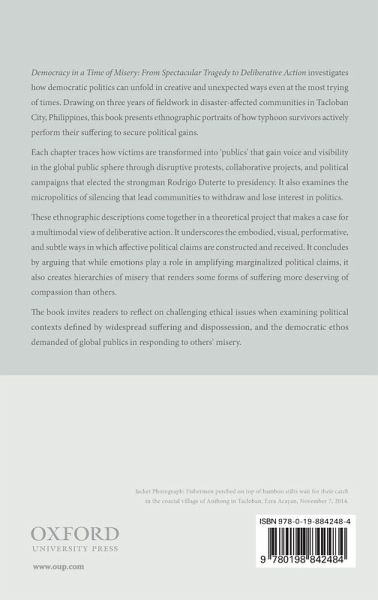 Democracy in a Time of Misery: From Spectacular Tragedy to Deliberative Action investigates how democratic politics can unfold in creative and unexpected of ways even at the most trying of times. Drawing on three years of fieldwork in disaster-affected communities in Tacloban City, Philippines, this book presents ethnographic portraits of how typhoon survivors actively perform their suffering to secure political gains. Each chapter traces how victims are transformed to 'publics' that gain voice and visibility in the global public sphere through disruptive protests, collaborative projects, and political campaigns that elected the strongman Rodrigo Duterte to presidency. It also examines the micropolitics of silencing that lead communities to withdraw and lose interest in politics. These ethnographic descriptions come together in a theoretical project that makes a case for a multimodal view of deliberative action. It underscores the embodied, visual, performative and subtle ways in which affective political claims are constructed and received. It concludes by arguing that while emotions play a role in amplifying marginalized political claims, it also creates hierarchies of misery that renders some forms of suffering more deserving of compassion than others. The book invites readers to reflect on challenging ethical issues when examining political contexts defined by widespread depravity and dispossession, and the democratic ethos demanded of global publics in responding to others' suffering.