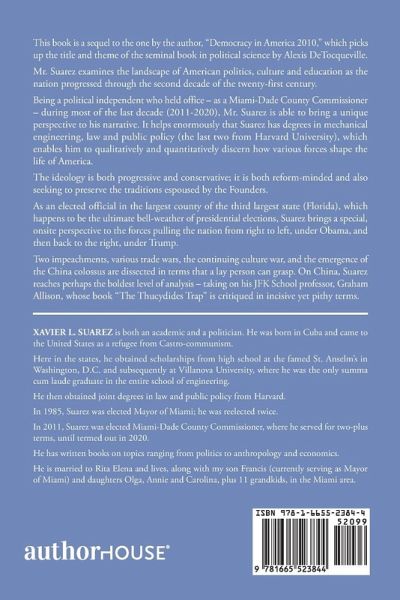 This book is a sequel to the one by the author, "Democracy in America 2010," which picks up the title and theme of the seminal book in political science by Alexis DeTocqueville. Mr. Suarez examines the landscape of American politics, culture and education as the nation progressed through the second decade of the twenty-first century. Being a political independent who held office - as a Miami-Dade County Commissioner - during most of the last decade (2011-2020), Mr. Suarez is able to bring a unique perspective to his narrative. It helps enormously that Suarez has degrees in mechanical engineering, law and public policy (the last two from Harvard University), which enables him to qualitatively and quantitatively discern how various forces shape the life of America. The ideology is both progressive and conservative; it is both reform-minded and also seeking to preserve the traditions espoused by the Founders. As an elected official in the largest county of the third largest state (Florida), which happens to be the ultimate bell-weather of presidential elections, Suarez brings a special, onsite perspective to the forces pulling the nation from right to left, under Obama, and then back to the right, under Trump. Two impeachments, various trade wars, the continuing culture war, and the emergence of the China colossus are dissected in terms that a lay person can grasp. On China, Suarez reaches perhaps the boldest level of analysis - taking on his JFK School professor, Graham Allison, whose book "The Thucydides Trap" is critiqued in incisive yet pithy terms.