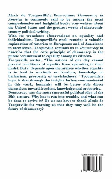 "Nothing is more wonderful than the art of being free, but nothing is harder to learn how to use than freedom." -Alexis de TocquevilleAlexis de Tocqueville's four-volume Democracy in America is commonly said to be among the most comprehensive and insightful books ever written about the United States and the greatest works of nineteenth-century political writing.With its trenchant observations on equality and individualism, Tocqueville's work remains a valuable explanation of America to Europeans and of Americans to themselves. Tocqueville reminds us in Democracy in America that the core principle of democracy is the public commitment to equality among its citizens.Tocqueville writes, "The nations of our day cannot prevent conditions of equality from spreading in their midst. But it depends upon themselves whether equality is to lead to servitude or freedom, knowledge or barbarism, prosperity or wretchedness." Tocqueville's hope is that through the insights he has communicated in this work, humanity will be better able direct themselves toward freedom, knowledge and prosperity.Democracy was the most successful political idea of the 20th century. Why has it run into trouble, and what can be done to revive it? Do we not have to thank Alexis de Tocqueville for warning us that they may well be the future of democracy?Complete Four-Book Edition with Footnotes and Appendix. Included: Constitution Of The United States Of America - United States Bill of Rights.
