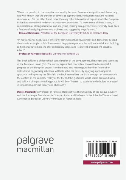 This book calls for a philosophical consideration of the development, challenges and successes of the European Union. The author argues that conceptual innovation is essential if progress on the European project is to be made; new meanings, rather than financial or institutional engineering solutions, will help solve the crisis. By applying a philosophical approach to diagnosing the EU crisis, the book reconsiders the basic concepts of democracy in the context of the complex reality of the EU and the globalised world where profound social and political changes are taking place. It will be of interest to students and scholars interested in EU politics, political theory and philosophy.