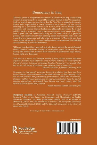 This book proposes a significant reassessment of the history of Iraq, documenting democratic experiences from ancient Mesopotamia through to the US occupation. Such an analysis takes to task claims that the 'West' has a uniquely democratic history and a responsibility to spread democracy across the world. It also reveals that Iraq has a democratic history all of its own, from ancient Middle Eastern assemblies and classical Islamic theology and philosophy, through to the myriad political parties, newspapers and protest movements of more recent times. This book argues that the democratic history of Iraq could serve as a powerful political and discursive tool where the Iraqi people may come to feel a sense of ownership over democracy and take pride in endorsing it. This could go a long way towards mitigating the current conflicts across the nation and in stabilizing and legitimating its troubled democracy. Taking an interdisciplinary approach and referring to some of the most influential critical theorists to question ideological assumptions about democracy and its history, this book is useful to those interested in political and legal history, human rights and democracy.