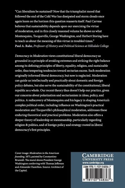 Democracy in Moderation views constitutional liberal democracy as grounded in a principle of avoiding extremes and striking the right balance among its defining principles of liberty, equality, religion, and sustainable order, thus tempering tendencies toward sectarian excess. Such moderation originally informed liberal democracy, but now is neglected. Moderation can guide us intellectually and practically about domestic and foreign policy debates, but also serve the sustainability of the constitutional, liberal republic as a whole. Our recent theory thus doesn't help our practice, given our concerns about polarization and sectarianism in ideas, policy, and politics. A rediscovery of Montesquieu and his legacy in shaping America's complex political order, including influence on Washington's practical moderation and Tocqueville's philosophical moderation, addresses these enduring theoretical and practical problems. Moderation also offers a deeper theory of leadership or statesmanship, particularly regarding religion and politics, and of foreign policy and strategy rooted in liberal democracy's first principles.