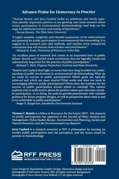 In spite of the expanding role of public participation in environmental decisionmaking, there has been little systematic examination of whether it has, to date, contributed toward better environmental management. Neither have there been extensive empirical studies to examine how participation processes can be made more effective. Democracy in Practice brings together, for the first time, the collected experience of 30 years of public involvement in environmental decisionmaking. Using data from 239 cases, the authors evaluate the success of public participation and the contextual and procedural factors that lead to it. Thomas Beierle and Jerry Cayford demonstrate that public participation has not only improved environmental policy, but it has also played an important educational role and has helped resolve the conflict and mistrust that often plague environmental issues. Among the authors' findings are that intensive 'problem-solving' processes are most effective for achieving a broad set of social goals, and participant motivation and agency responsiveness are key factors for success. Democracy in Practice will be useful for a broad range of interests. For researchers, it assembles the most comprehensive data set on the practice of public participation, and presents a systematic typology and evaluation framework. For policymakers, political leaders, and citizens, it provides concrete advice about what to expect from public participation, and how it can be made more effective. Democracy in Practice concludes with a systematic guide for use by government agencies in their efforts to design successful public participation efforts.