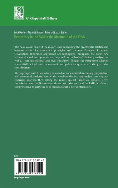 The book covers some of the major issues concerning the problematic relationship between respect for democratic principles and the new European Economic Governance. Innovative approaches are highlighted throughout the book: new frameworks and arrangements are proposed on the basis of efficiency analyses, as well as their institutional and legal suitability. Though the perspective adopted is essentially a legal one, the economic and policy background are also given due consideration.The papers presented here offer a balanced mix of empirical (including comparative) and theoretical analysis; several also combine the two approaches, carrying out empirical analyses, then setting the results against theoretical options. Given the relative dearth of literature on democratic principles and the EMU, let alone a comprehensive enquiry, the book marks a valuable new contribution.