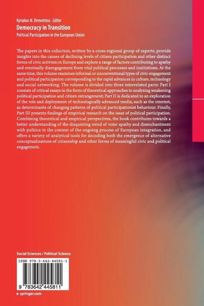 ,The papers in this collection, written by a cross-regional group of experts, provide insights into the causes of declining levels of citizen participation and other distinct forms of civic activism in Europe and explore a range of factors contributing to apathy and eventually disengagement from vital political processes and institutions. At the same time, this volume examines informal or unconventional types of civic engagement and political participation corresponding to the rapid advances in culture, technology and social networking. The volume is divided into three interrelated parts: Part I consists of critical essays in the form of theoretical approaches to analysing weakening political participation and citizen estrangement; Part II is dedicated to an exploration of the role and deployment of technologically advanced media, such as the internet, as determinants of changing patterns of political participationist behaviour. Finally, Part III presents findings of empirical research on the issue of political participation. Combining theoretical and empirical perspectives, the book contributes towards a better understanding of the disquieting trend of voter apathy and disenchantment with politics in the context of the ongoing process of European integration, and offers a variety of analytical tools for decoding both the emergence of alternative conceptualizations of citizenship and other forms of meaningful civic and political engagement.