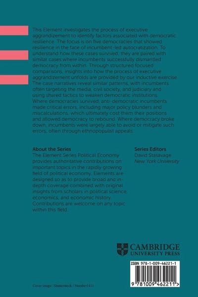 This Element investigates the process of executive aggrandizement to identify factors associated with democratic resilience. It focuses on five democracies that showed resilience in the face of incumbent-led autocratization. The paired cases provide insights into how the process of executive aggrandizement unfolds.