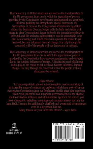 America's Democracy of Dollars is about a "legal" problem we have today in America. But it is not a law book written for lawyers. Nor is it a political book, taking sides with either conservatives or progressives. It is a book written for us Americans, to aid us in understanding a problem that affects each of us so each of us can chose to do something about it. It is also a book about context, not theory. What is the context of our times? As a society we have morphed from a Democracy of People into a Democracy of Dollars. Two political institutions of our federal government, the Legislative and the Executive Branches, designed to protect and serve all Americans, have become servants to special interests who, in today's pricey politics, have bought their way to the head of the line. But our national government has a co-equal third institution, the Judiciary Branch, the federal judiciary headed by the Supreme Court. The Judiciary Branch is intended by our Constitution's Framers to be independent and non-political - and, most important, the Judiciary Branch is intended to provide a check and balance on the other two Branches. However, in today's Democracy of Dollars, that mission has been failing. Our Supreme Court must assume a different role, a role it occupied in the past when times were equally as difficult and uncertain as today's times. What does all this have to do with you and me? We don't vote for federal judges, they're appointed by the President and confirmed by the Senate. However, public influence, over time, has a dynamic effect on the Court. Over time, in response to public outcries, unmet human needs, and changing circumstances, the Court has, among its accomplishments, modernized the definition of cruel and unusual punishment, and, perhaps, in its most shinning hour, decided that "separate but equal" education facilities do not provide black children with an equal education. In this book, we illustrate the Democracy of Dollars plight we face through three examples: First, we focus on the Supreme Court's deference through judge-made rules to the two political branches of government, particularly the Executive Branch, the effect of which is to deny too many people their Rights. Then, we focus on the plight of voters whose effectiveness is diluted by partisan gerrymandering. Finally, we focus on the effect of our Legislative Branch's uncontrolled delegation to the Executive Branch, which has resulted in the unfettered growth of our "Fourth Branch" of government, the administrative state, creating the "Era of Presidential Administration," driven by lobbies and special interests and not the will of the People. These examples led to the important conclusion: we each must be involved citizens. America's Democracy of Dollars is a call to action to each of us. We can, and we must influence the return of America to a Democracy of People. That effort requires each of us to pitch in and help.