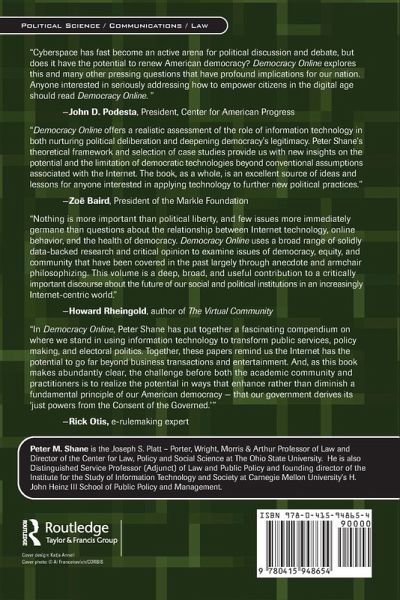 Part 1: The Potential for Democratic Technologies and New Political Practices 1. Technologies for Democracy 2. Cyberjuries: A Model of Deliberative Democracy? 3. Electronic Media and the Prospects for Transnational Democracy: Cyberspace as a cosmopolitan public sphere Part 2: Electronic Democracy and Democratic Revitalization 4. The Electronic Federalist: The Internet and the eclectic institutionalization of democratic legitimacy 5. Global Governance and Electronic Democracy: e-Politics as a multidimensional experience 6. Interactivity, Equality, and the Prospects for Electronic Democracy 7. Online Deliberation: Possibilities of the Internet for deliberative democracy 8. Hacktivism and the Future of Democratic Discourse 9. Getting Past Electronic Democracy Part 3: The Lessons of Electronic Democracy Practice 10. Digital Deliberation: Engaging the public through online policy dialogues 11. Participation, Deliberative Democracy and The Internet: Lessons from a national forum on commercial vehicle safety 12. Internet-based Political Discourse: A case-study of electronic democracy in the city of Hoogeveen 13. The League of Women Voters DemocracyNet (DNet): An exercise in online civic engagement Part 4: Social, Psychological and Political Contexts for Electronic Democracy 14. A Tale of Two Towns: Assessing the role of political resources in a community electronic network 15. Virtual Distance and America's Changing Sense of Community 16. Access, Skill, and Motivation In Online Political Discussion: The democratic digital divide 17. Virtual Deliberation: Knowledge from online interaction versus ordinary discussion 18. The Challenges of E-Democracy for Political Parties 19. Social Structure and Cyberspace: Towards a theory Part 5: Conclusion 20. The Prospects for Electronic Democracy: A research manifesto