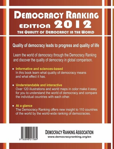 The Democracy Ranking measures on a regular and annual basis the quality of democracy and democracy improvement (increases and decreases of quality) in a world-wide comparison. The Democracy Ranking identifies one political and five non-political dimensions: politics (political system); gender equality (socioeconomic and educational); economy (economic system); knowledge (knowledge society and economy, education and research); health (health status and health system); and the environment (environmental sustainability). Quality of democracy leads to progress and quality of life. The Democracy Ranking Edition 2012 covers 110 countries. In this book you learn what quality of democracy means and what effect it has. Over 120 illustrations, and world maps in color, assist in understanding the world of democracy and for comparing the individual countries with each other. The Democracy Ranking offers new insight to 110 countries of the world by the world-wide ranking of democracies.