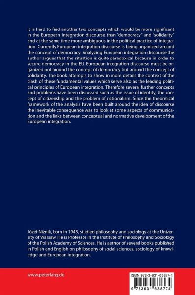 It is hard to find another two concepts which would be more significant in the European integration discourse than "democracy" and "solidarity" and at the same time more ambiguous in the political practice of integration. Currently European integration discourse is being organized around the concept of democracy. Analyzing European integration discourse the author argues that the situation is quite paradoxical because in order to secure democracy in the EU, European integration discourse must be organized not around the concept of democracy but around the concept of solidarity. The book attempts to show in more details the context of the clash of these fundamental values which serve also as the leading political principles of European integration. Therefore several further concepts and problems have been discussed such as the issue of identity, the concept of citizenship and the problem of nationalism. Since the theoretical framework of the analysis have been built around the idea of discourse the inevitable consequence was to look at some aspects of communication and the links between conceptual and normative development of the European integration.
