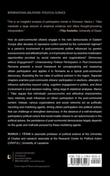 Introduction Chapter 1: Theories of Democracy and Political Participation Chapter 2: Contextualizing Political Participation in Romania after 1989. The Illusions and Disappointments of the Post-Communist Transition Chapter 3: The Dynamics of Electoral Participation and Types of Voters Chapter 4: Participation as Attempts to Influence Public Authorities Chapter 5: Cognitive Political Engagement: Information, Discussion, and Knowledge on Politics Chapter 6: Participation in Local Decision Making Chapter 7: Searching for "Another Democracy"? Changing Patterns of Political Participation during the Economic Crisis Conclusion