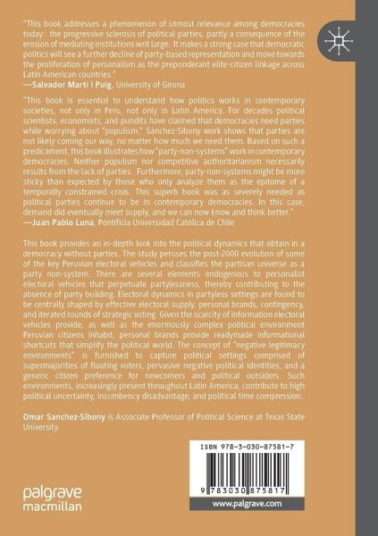 This book provides an in-depth look into key political dynamics that obtain in a democracy without parties, offering a window into political undercurrents increasingly in evidence throughout the Latin American region, where political parties are withering. For the past three decades, Peru has showcased a political universe populated by amateur politicians and the dominance of personalism as the main party-voter linkage form. The study peruses the post-2000 evolution of some of the key Peruvian electoral vehicles and classifies the partisan universe as a party non-system. There are several elements endogenous to personalist electoral vehicles that perpetuate partylessness, contributing to the absence of party building. The book also examines electoral dynamics in partyless settings, centrally shaped by effective electoral supply, personal brands, contingency, and iterated rounds of strategic voting calculi. Given the scarcity of information electoralvehicles provide, as well as the enormously complex political environment Peruvian citizens inhabit, personal brands provide readymade informational shortcuts that simplify the political world. The concept of "negative legitimacy environments" is furnished to capture political settings comprised of supermajorities of floating voters, pervasive negative political identities, and a generic citizen preference for newcomers and political outsiders. Such environments, increasingly present throughout Latin America, produce several deleterious effects, including high political uncertainty, incumbency disadvantage, and political time compression. Peru's "democracy without parties" fails to deliver essential democratic functions including governability, responsiveness, horizontal and vertical accountability, or democratic representation, among others.