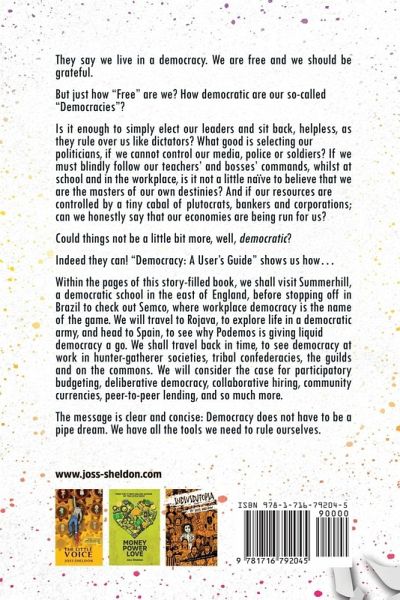 THEY SAY WE LIVE IN A DEMOCRACY. WE ARE FREE AND WE SHOULD BE GRATEFUL. But just how "Free" are we? How democratic are our so-called "Democracies"? Is it enough to simply elect our leaders and sit back, helpless, as they rule over us like dictators? What good is selecting our politicians, if we cannot control our media, police or soldiers? If we must blindly follow our teachers' and bosses' commands, whilst at school and in the workplace, is it not a little naïve to believe that we are the masters of our own destinies? And if our resources are controlled by a tiny cabal of plutocrats, bankers and corporations; can we honestly say that our economies are being run for us? Could things not be a little bit more, well, democratic? Indeed they can! "Democracy: A User's Guide" shows us how... Within the pages of this story-filled book, we shall visit Summerhill, a democratic school in the east of England, before stopping off in Brazil to check out Semco, where workplace democracy is the name of the game. We will travel to Rojava, to explore life in a democratic army, and head to Spain, to see why Podemos is giving liquid democracy a go. We shall travel back in time, to see democracy at work in hunter-gatherer societies, tribal confederacies, the guilds and on the commons. We will consider the case for participatory budgeting, deliberative democracy, collaborative hiring, community currencies, peer-to-peer lending, and much much more. The message is clear and concise: Democracy does not have to be a pipe dream. We have all the tools we need to rule ourselves. Get your copy of Joss Sheldon's new masterpiece today...