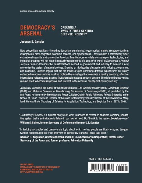 An expert explains why the security needs of the twenty-first century require a transformation of the defense industry of the twentieth century. New geopolitical realities—including terrorism, pandemics, rogue nuclear states, resource conflicts, insurgencies, mass migration, economic collapse, and cyber attacks—have created a dramatically different national-security environment for America. Twentieth-century defense strategies, technologies, and industrial practices will not meet the security requirements of a post-9/11 world. In Democracy's Arsenal, Jacques Gansler describes the transformations needed in government and industry to achieve a new, more effective system of national defense. Drawing on his decades of experience in industry, government, and academia, Gansler argues that the old model of ever-increasing defense expenditures on largely outmoded weapons systems must be replaced by a strategy that combines a healthy economy, effective international relations, and a strong (but affordable) national security posture. The defense industry must remake itself to become responsive and relevant to the needs of twenty-first-century security.