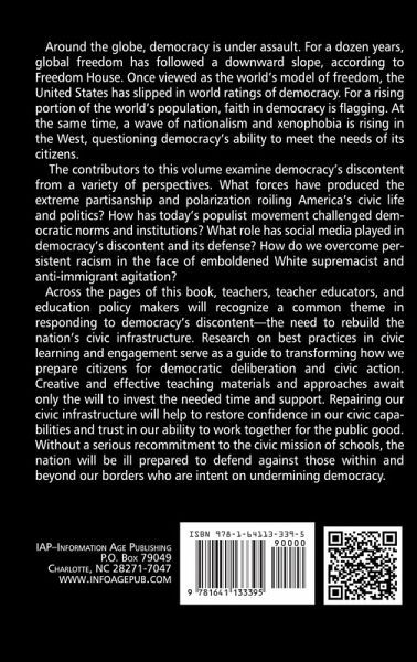 Around the globe, democracy is under assault. For a dozen years, global freedom has followed a downward slope, according to Freedom House. Once viewed as the world's model of freedom, the United States has slipped in world ratings of democracy. For a rising portion of the world's population, faith in democracy is flagging. At the same time, a wave of nationalism and xenophobia is rising in the West, questioning democracy's ability to meet the needs of its citizens. The contributors to this volume examine democracy's discontent from a variety of perspectives. What forces have produced the extreme partisanship and polarization roiling America's civic life and politics? How has today's populist movement challenged democratic norms and institutions? What role has social media played in democracy's discontent and its defense? How do we overcome persistent racism in the face of emboldened White supremacist and anti-immigrant agitation? Across the pages of this book, teachers, teacher educators, and education policy makers will recognize a common theme in responding to democracy's discontent - the need to rebuild the nation's civic infrastructure. Research on best practices in civic learning and engagement serve as a guide to transforming how we prepare citizens for democratic deliberation and civic action. Creative and effective teaching materials and approaches await only the will to invest the needed time and support. Repairing our civic infrastructure will help to restore confidence in our civic capabilities and trust in our ability to work together for the public good. Without a serious recommitment to the civic mission of schools, the nation will be ill prepared to defend against those within and beyond our borders who are intent on undermining democracy.