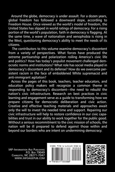 Around the globe, democracy is under assault. For a dozen years, global freedom has followed a downward slope, according to Freedom House. Once viewed as the world's model of freedom, the United States has slipped in world ratings of democracy. For a rising portion of the world's population, faith in democracy is flagging. At the same time, a wave of nationalism and xenophobia is rising in the West, questioning democracy's ability to meet the needs of its citizens. The contributors to this volume examine democracy's discontent from a variety of perspectives. What forces have produced the extreme partisanship and polarization roiling America's civic life and politics? How has today's populist movement challenged democratic norms and institutions? What role has social media played in democracy's discontent and its defense? How do we overcome persistent racism in the face of emboldened White supremacist and anti-immigrant agitation? Across the pages of this book, teachers, teacher educators, and education policy makers will recognize a common theme in responding to democracy's discontent - the need to rebuild the nation's civic infrastructure. Research on best practices in civic learning and engagement serve as a guide to transforming how we prepare citizens for democratic deliberation and civic action. Creative and effective teaching materials and approaches await only the will to invest the needed time and support. Repairing our civic infrastructure will help to restore confidence in our civic capabilities and trust in our ability to work together for the public good. Without a serious recommitment to the civic mission of schools, the nation will be ill prepared to defend against those within and beyond our borders who are intent on undermining democracy.