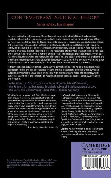 Democracy has been a flawed hegemony since the fall of communism. Its flexibility, its commitment to equality of representation, and its recognition of the legitimacy of opposition politics are all positive features for political institutions. But democracy has many deficiencies: it is all too easily held hostage by powerful interests; it often fails to advance social justice; and it does not cope well with a number of features of the political landscape, such as political identities, boundary disputes, and environmental crises. Although democracy is valuable it fits uneasily with other political values and is in many respects less than equal to the demands it confronts. In this volume (and its companion Democracy's Edges) prominent political theorists and social scientists present original discussions of such central issues. Democracy's Values deals with the nature and value of democracy, particularly the tensions between it and such goods as justice, equality, efficiency, and freedom.