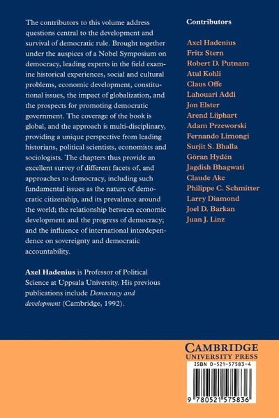 The contributors to this volume address questions central to the development and survival of democratic rule. Brought together under the auspices of a Nobel Symposium on democracy, leading experts in the field examine historical experiences, social and cultural problems, economic development, constitutional issues, the impact of globalization, and the prospects for promoting democratic government. The coverage of the book is global, and the approach is multidisciplinary, providing a unique perspective from leading historians, political scientists, economists, and sociologists. The chapters thus provide an excellent survey of different facets of, and approaches to, democracy, including such fundamental issues as the nature of democratic citizenship, and its prevalence around the world; the relationship between economic development and the progress of democracy; and the influence of international interdependence on sovereignty and democratic accountability.