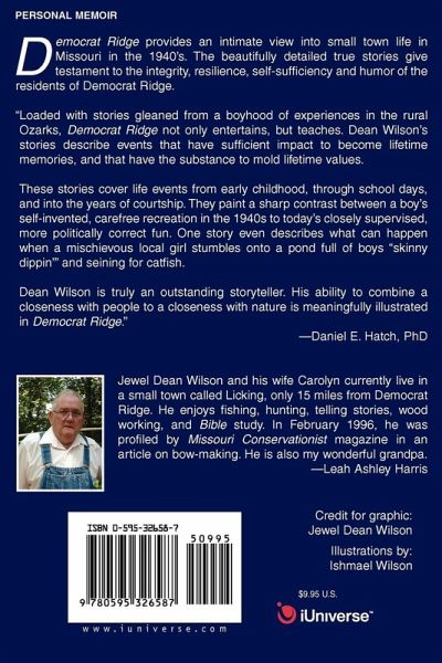 Democrat Ridge provides an intimate view into small town life in Missouri in the 1940's. The beautifully detailed true stories give testament to the integrity, resilience, self-sufficiency and humor of the residents of Democrat Ridge. "Loaded with stories gleaned from a boyhood of experiences in the rural Ozarks, Democrat Ridge not only entertains, but teaches. Dean Wilson's stories describe events that have sufficient impact to become lifetime memories, and that have the substance to mold lifetime values. These stories cover life events from early childhood, through school days, and into the years of courtship. They paint a sharp contrast between a boy's self-invented, carefree recreation in the 1940s to today's closely supervised, more politically correct fun. One story even describes what can happen when a mischievous local girl stumbles onto a pond full of boys "skinny dippin'" and seining for catfish. Dean Wilson is truly an outstanding storyteller. His ability to combine a closeness with people to a closeness with nature is meaningfully illustrated in Democrat Ridge."--Daniel E. Hatch, PhD