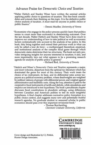 This work examines tax policies and tax systems as they arise from democratic choices, set against the background of a market economy. Professors Hettich and Winer find that democratic institutions yield complex tax systems with features that follow a varied but predictable pattern. In developing their analysis, the authors use formal modelling of voting behavior, emphasizing recent advances in the theory of probabilistic voting. This book differs from the available tax literature by relating fiscal choices directly to voting and by examining tax systems in democratic countries from a variety of perspectives. While the authors primarily focus on explaining observed features of tax systems, they also devote considerable space to the discussion of the welfare and efficiency effects of taxation in the presence of collective choice, and to a review of other models and of the related literature. In addition, they use computational general equilibrium analysis and statistical research on national and state governments in the US and Canada to link theory to empirical data.
