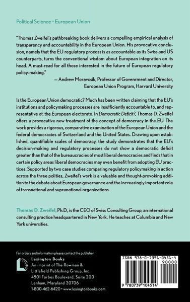 A lively, incisive piece of work that straddles the (vanishing) line between international relations and comparative politics. Thomas Zweifel has delivered a provocative and counterintuitive treatment of the EU's democratic deficit which is well worth our reflection. -- John Peterson, University of Glasgow unlike many observers, he comes to what he himself calls "a surprising conclusion" Humanities and Social Science Reviews Online, June 2010 Thomas Zweifel's pathbreaking book Democratic Deficit? delivers a compelling empirical analysis of transparency and accountability in the European Union. His provocative conclusion, namely that the EU regulatory process is as accountable as its Swiss and US counterparts, turns the conventional wisdom about European integration on its head. A must-read for all those interested in the future of European regulatory policy-making. -- Andrew Moravcsik, Professor of Government and Director, European Union Program, Harvard University