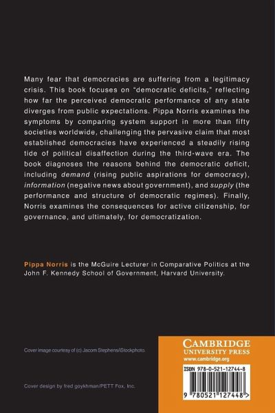 Many fear that democracies are suffering from a legitimacy crisis. This book focuses on 'democratic deficits', reflecting how far the perceived democratic performance of any state diverges from public expectations. Pippa Norris examines the symptoms by comparing system support in more than fifty societies worldwide, challenging the pervasive claim that most established democracies have experienced a steadily rising tide of political disaffection during the third-wave era. The book diagnoses the reasons behind the democratic deficit, including demand (rising public aspirations for democracy), information (negative news about government) and supply (the performance and structure of democratic regimes). Finally, Norris examines the consequences for active citizenship, for governance and, ultimately, for democratization. This book provides fresh insights into major issues at the heart of comparative politics, public opinion, political culture, political behavior, democratic governance, political psychology, political communications, public policymaking, comparative sociology, cross-national survey analysis and the dynamics of the democratization process. Focusing on 'democratic deficits', this book reflects on how far the perceived democratic performance of any state diverges from public expectations. The book provides fresh insights into major issues at the heart of the study of comparative politics, public opinion, political culture and political communications.