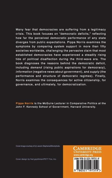 Many fear that democracies are suffering from a legitimacy crisis. This book focuses on 'democratic deficits', reflecting how far the perceived democratic performance of any state diverges from public expectations. Pippa Norris examines the symptoms by comparing system support in more than fifty societies worldwide, challenging the pervasive claim that most established democracies have experienced a steadily rising tide of political disaffection during the third-wave era. The book diagnoses the reasons behind the democratic deficit, including demand (rising public aspirations for democracy), information (negative news about government) and supply (the performance and structure of democratic regimes). Finally, Norris examines the consequences for active citizenship, for governance and, ultimately, for democratization. This book provides fresh insights into major issues at the heart of comparative politics, public opinion, political culture, political behavior, democratic governance, political psychology, political communications, public policymaking, comparative sociology, cross-national survey analysis and the dynamics of the democratization process.