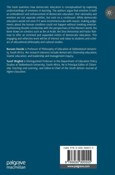 This book examines how democratic education is conceptualised by exploring understandings of emotions in learning. The authors argue that emotion is both an embodiment and enhancement of democratic education: that rationality and emotion are not separate entities, but exist on a continuum. While democratic education would not exist if it were incommensurate with reason, making judgements about the human condition could not happen without invoking emotion. Synthesising Muslim scholarship with the perspectives of the Western world, the book draws on scholars such as Ibn al-Arabi, Ibn Sina (Avicenna) and Fazlur Rahman to offer an enriched and expanded notion of democratic education. This engaging and reflective work will be of interest and value to students and scholars of educational philosophy and cultural studies.