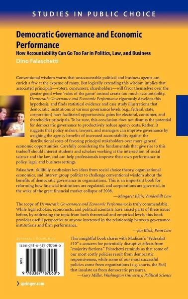 Conventional wisdom warns that unaccountable political and business agents can enrich a few at the expense of many. But logically extending this wisdom implies that associated principals - voters, consumers, shareholders - will favor themselves over the greater good when 'rules of the game' instead create too much accountability. Democratic Governance and Economic Performance rigorously develops this hypothesis, and finds statistical evidence and case study illustrations that democratic institutions at various governance levels (e.g., federal, state, corporation) have facilitated opportunistic gains for electoral, consumer, and shareholder principals. To be sure, this conclusion does not dismiss the potential for democratic governance to productively reduce agency costs. Rather, it suggests that policy makers, lawyers, and managers can improve governance by weighing the agency benefits of increased accountability against the distributional costs of favoring principal stakeholders over more general economic opportunities. Carefully considering the fundamentals that give rise to this tradeoff should interest students and scholars working at the intersection of social science and the law, and can help professionals improve their own performance in policy, legal, and business settings.