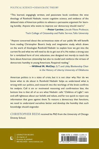 Chapter 1: Moderating our Pretensions: Niebuhr on Being Human Chapter 2: Between Sentimentality and Pessimism: Niebuhr on Democracy Chapter 3: Neuroscientists for Niebuhr Chapter 4: Rattlers and Eagles/Democrats and Republicans Chapter 5: Partisan Infotainment: A New Business Model for the New Media Chapter 6: Partisan Infotainment and Democracy: Not All Bad, Not Half Good Chapter 7: Weapons and Instruments: Using Government to Fix Government Chapter 8: Religion: "a constant fount of humility" Chapter 9: "Guardians of Democracy": Democratic Humility through Civic Education Conclusion: Democratic Humility