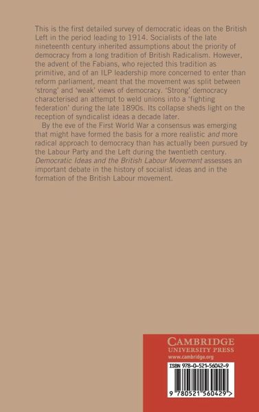 This is the first detailed survey of democratic ideas on the British Left in the period leading to 1914. Socialists of the late nineteenth century inherited assumptions about the priority of democracy from a long tradition of British Radicalism. However, the advent of the Fabians, who rejected this tradition as primitive, and of an ILP leadership more concerned to enter than reform parliament, meant that the movement was split between 'strong' and 'weak' views of democracy. By the eve of the First World War a consensus was emerging that might have formed the basis for a more realistic and more radical approach to democracy than has actually been pursued by the Labour Party and the Left during the twentieth century. Democratic Ideas and the British Labour Movement assesses an important debate in the history of socialist ideas and in the formation of the British Labour movement.