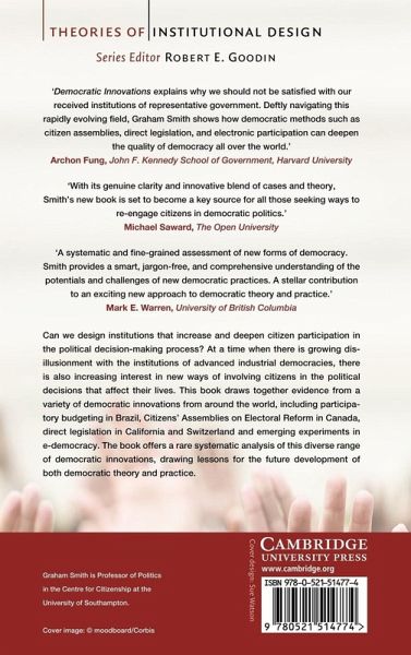 'Democratic Innovations explains why we should not be satisfied with our received institutions of representative government. Deftly navigating this rapidly evolving field, Graham Smith shows how democratic methods such as citizen assemblies, direct legislation, and electronic participation can deepen the quality of democracy all over the world.' Archon Fung, John F. Kennedy School of Government, Harvard University