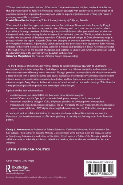 "Ever since I first had the opportunity to review the first edition of Democratic Latin America by Craig L. Arceneaux there has not been a textbook for any of the regions I teach that I am more excited about. It provides a thorough overview of all the major institutional dynamics that you would want students to understand, while also providing detailed examples from individual countries. The latest edition includes valuable new discussions of the peace accords in Colombia, political changes in Cuba, the recent surge in protests all over the region (especially Chile), new examples of executive removals and impeachments, and the evangelical movement. A particularly useful addition is the discussion of neo-populism in Latin America, reflected in the recent elections of Lopez Obrador in Mexico and Bolsonaro in Brazil. Arceneaux provides a thorough overview of the concept of populism and explores its unique Latin American features as well as the characteristics of the current wave of populism in the region."