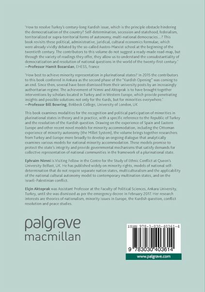 1. Democratic Nation States and the Antinomies of Minority Representation: The Impact on the Turkish Republic.- 2. Re-Politicizing Non-Territorial Autonomy.- 3. Democratic Autonomy as a Means of Conflict Resolution and Self-Government?.- 4. National Cultural Autonomy in Central and Eastern Europe.- 5. Non-Territorial Autonomy and Western European Diversity Management Regimes: Lessons and Examples for the Turkish Republic.- 6. A Nation-State or a Multinational State? National Conceptions, Minorities and Self-Determination in Spain.- 7. The Kurdish Opening in Turkey: Between Authoritarianism and Peace.- 8. Are Non-Turkish Languages Banned in Turkey?.- 9. Kurdish Movement's Democratic Autonomy Proposal in Turkey.- 10. Territorial Autonomy and Democratization in Turkey: Prospects and Predicaments.-11. Mapping Rojava: Ideas of Democratic Confederalism and Non-Territorial Autonomy.