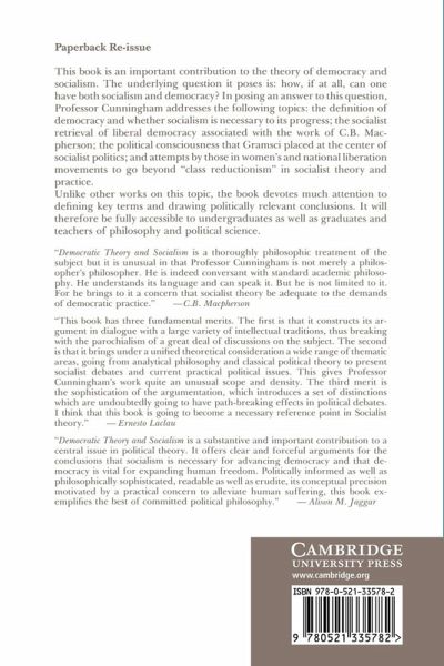 This book is an important contribution to the theory of democracy and socialism. The underlying question it poses is: how, if at all, can one have both socialism and democracy? In posing an answer to this question, Professor Cunningham addresses the following topics: the definition of democracy and whether socialism is necessary to its progress: the socialist retrieval of liberal democracy associated with the work of C. B. Macpherson: the political consciousness that Gramsci placed at the center of socialist politics: and attempts by those in women's and national liberation movements to go beyond 'class reductionism' in socialist theory and practice. Unlike other works on this topic, the book devotes much attention to defining key terms and drawing politically relevant conclusions. It will therefore be fully accessible to undergraduates as well as graduates and teachers of philosophy and political science.